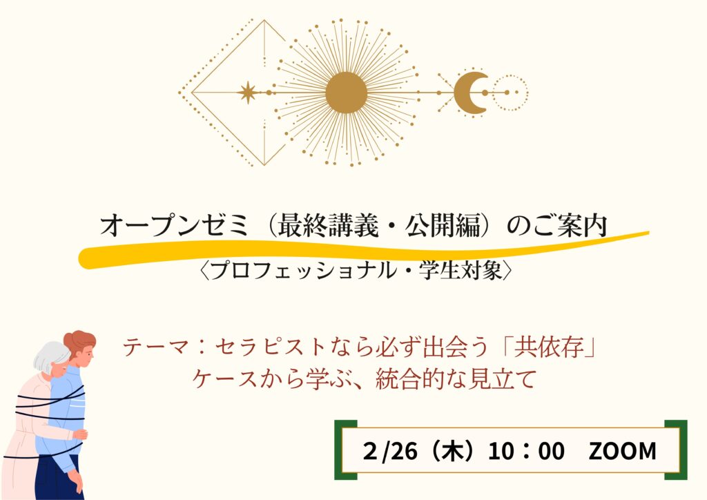今回のオープンゼミは、その最終講義の前半部分を公開し、これまで積み重ねてきた理論と実践を、実際の臨床ケースを通して統合し、現場でどのように活かしていくのかを、具体的に解説します。